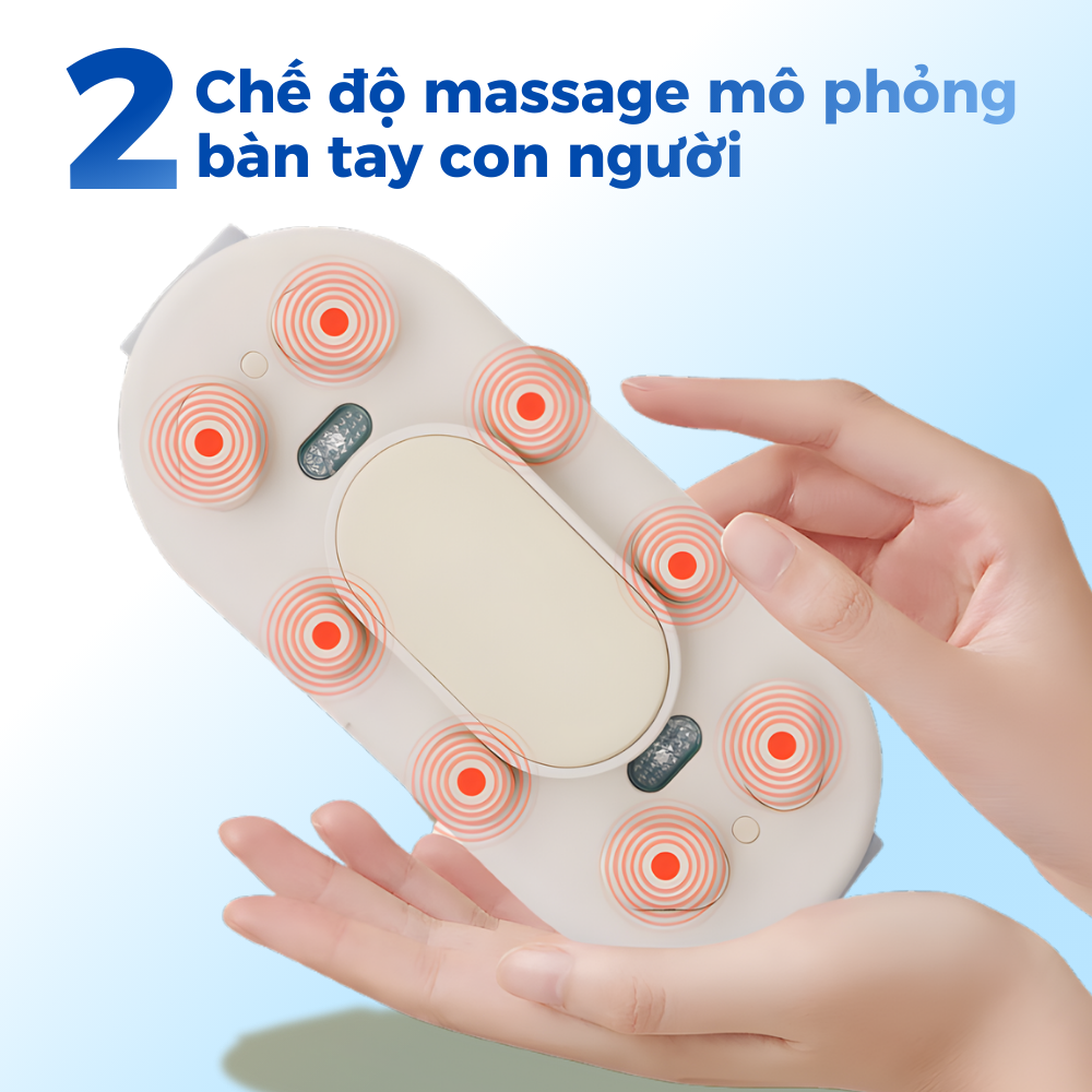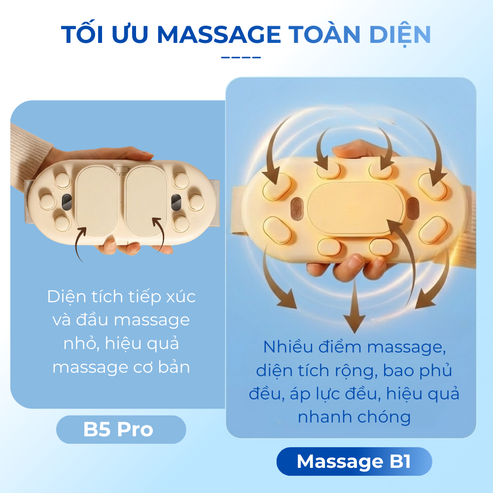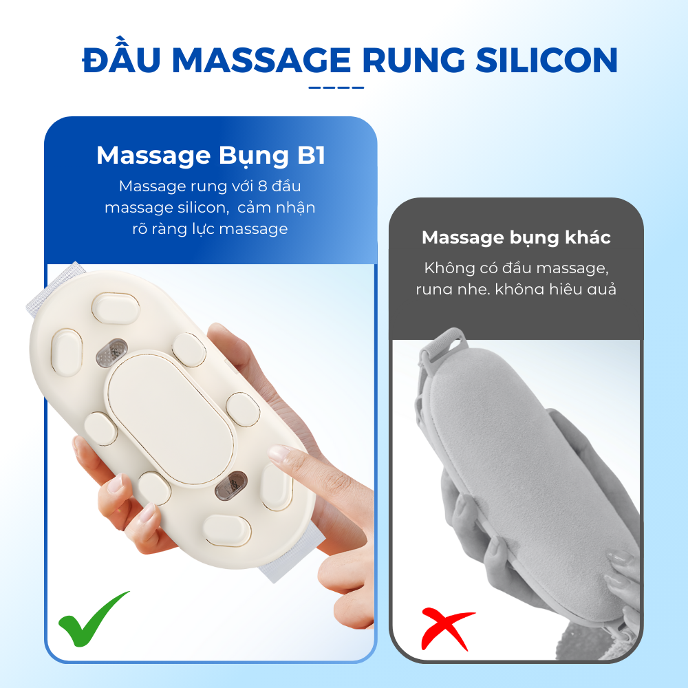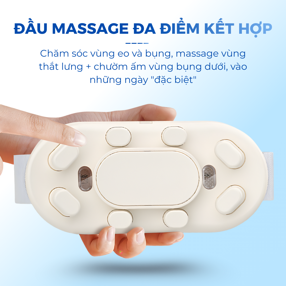 Máy massage bụng B1 là đai massage bụng kinh chuyên dụng, tích hợp 8 đầu massage mô phỏng tay người, kết hợp 3 cấp độ rung và 3 mức chườm ấm nhiệt hồng ngoại, giúp làm dịu nhanh cơn co thắt, giảm đau bụng kinh và thư giãn vùng bụng – eo – lưng dưới hiệu quả. Thiết bị hỗ trợ làm mềm cơ, tăng tuần hoàn máu và giảm mỏi cơ cho người ngồi lâu hoặc vận động nhiều.