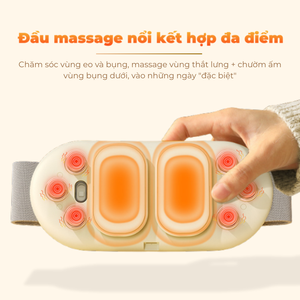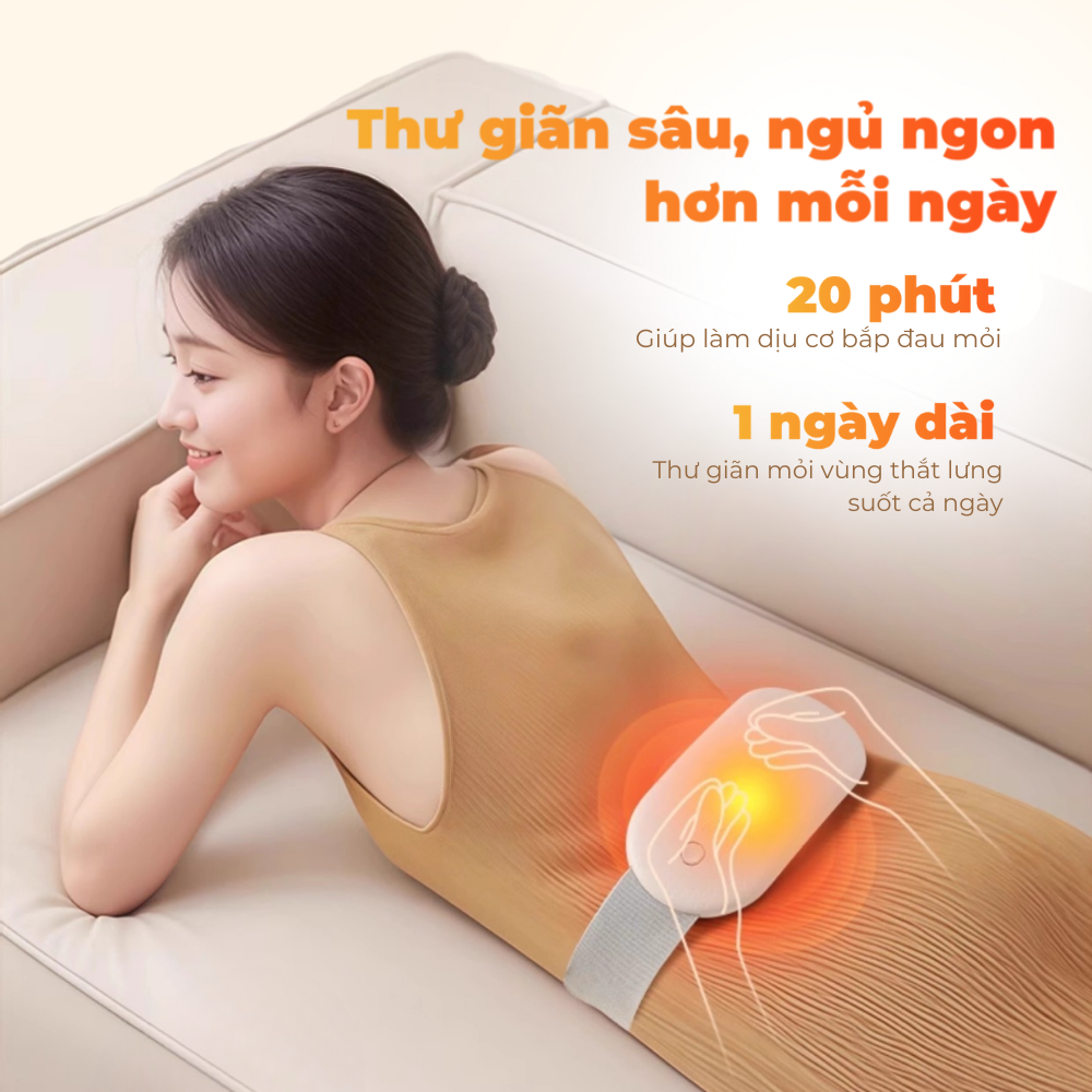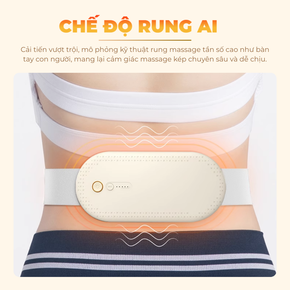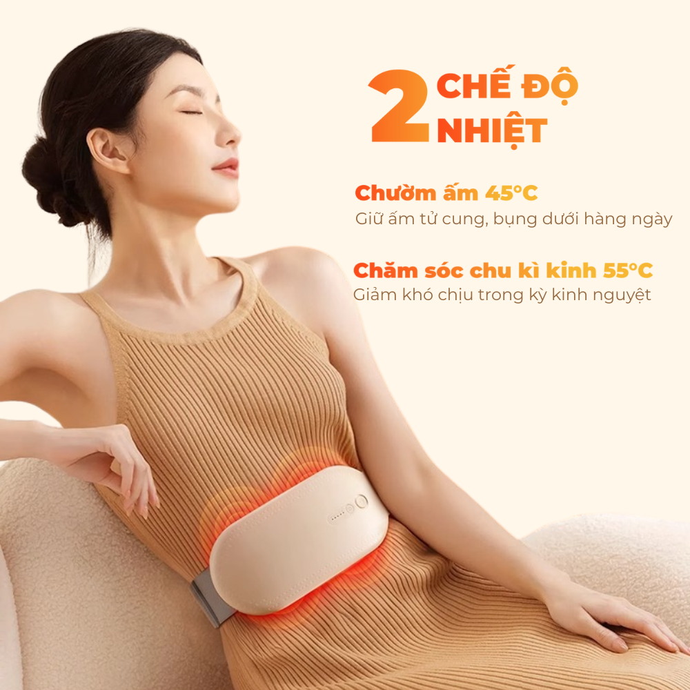 Chườm ấm thông minh: Với 2 cấp độ nhiệt 45°C và 55°C, giúp tăng cường lưu thông máu, làm dịu cơn co thắt và giảm đau bụng kinh hiệu quả. Bạn vẫn cảm nhận được rõ ràng độ ấm khi đeo ngoài lớp áo mỏng.